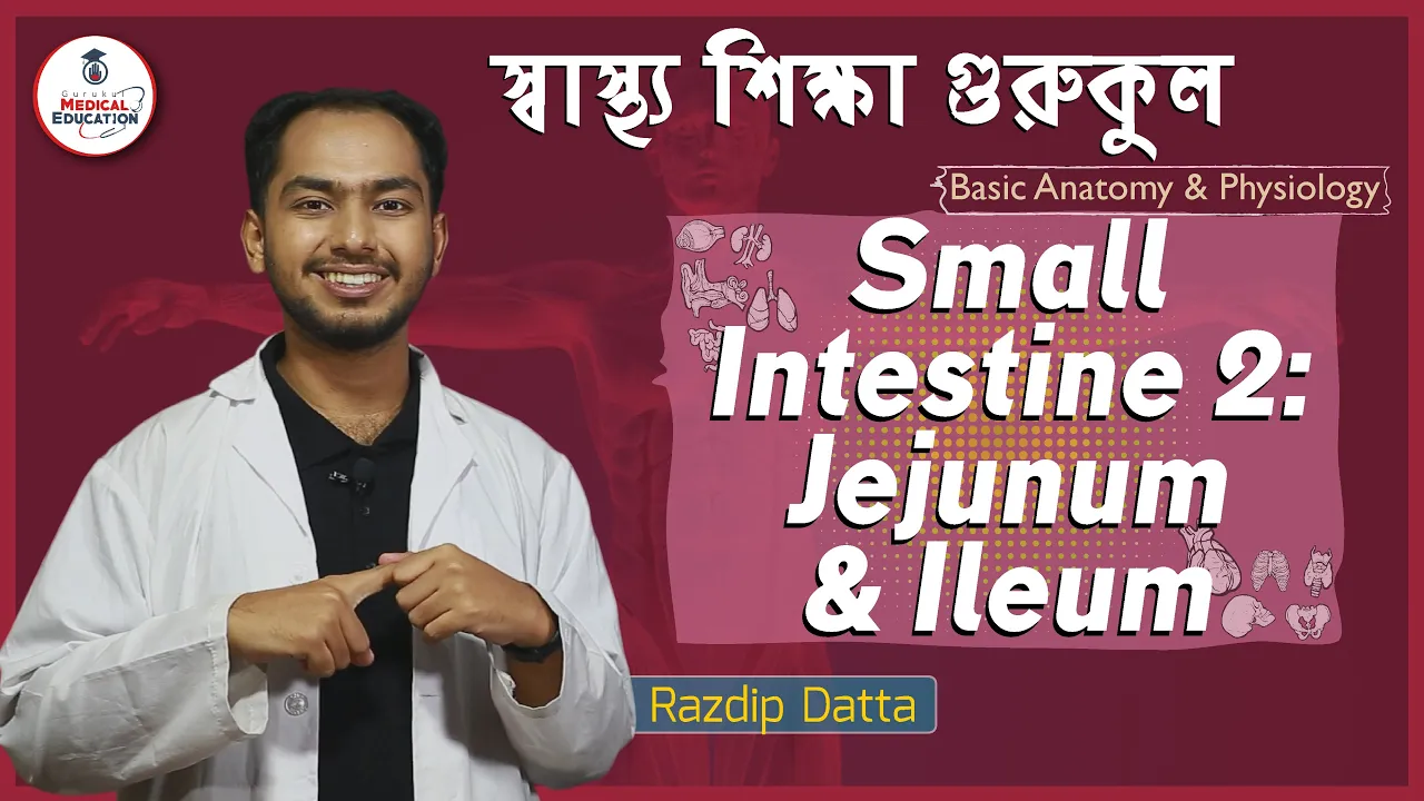 ক্ষুদ্রান্ত্র ২ঃ জেজুনাম এবং ইলিয়াম আজকের আলোচনা বিষয় |The small intestine is an organ in the gastrointestinal tract where most of the end absorption of nutrients and minerals from food takes place. It lies between the stomach and large intestine and receives bile and pancreatic juice through the pancreatic duct to aid in digestion. It is divided into three parts: Duodenum, Jejunum, Ileum.ক্ষুদ্রান্ত্র ২ঃ জেজুনাম এবং ইলিয়াম (small intestine: jejunum & ileum) ক্লাসটি বেসিক এনাটমি এন্ড ফিজিওলজি (Basic Anatomy and Physiology) কোর্সের অংশ |